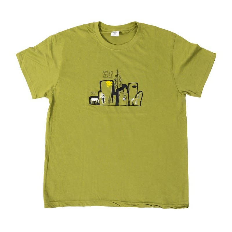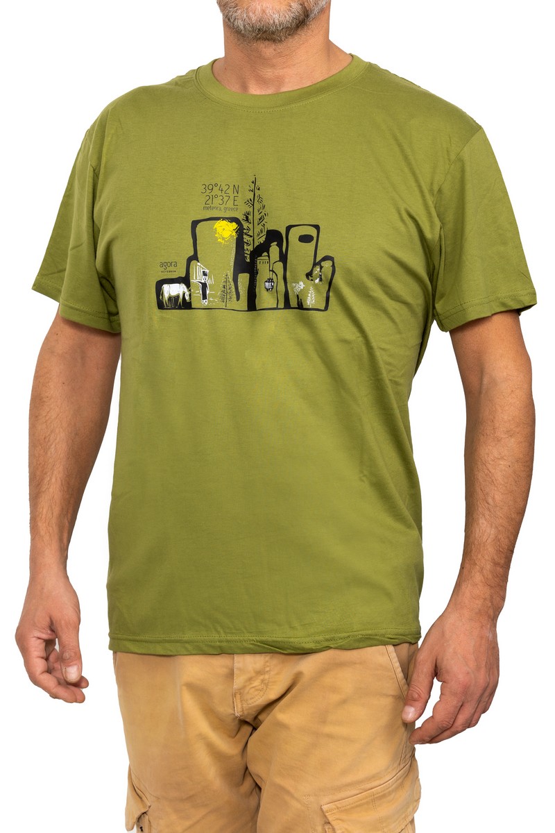 Men’s or unisex olive green t-shirt with print on the front, Meteora. Made of 100% cotton in a regular line. Designed and printed in Greece
